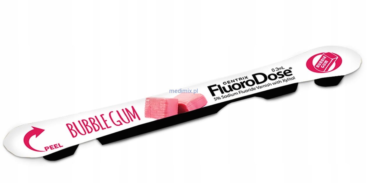 Fluoro Dose jest lakierem fluorującym zawierającym 5% fluorku sodu (22 600 ppm), pakowanego w jednorazowych dawkach LolliPack®, całkowicie aseptycznych i łatwych w zastosowaniu. Fluoro DoseTM nie barwi zębów na żółto i nie ma gorzkiego smaku. Wystarczy zdjąć opakowanie, osuszyć zęby, zanurzyć aplikator i można nakładać. Dawka fluoru dopuszczona przez FDA.
