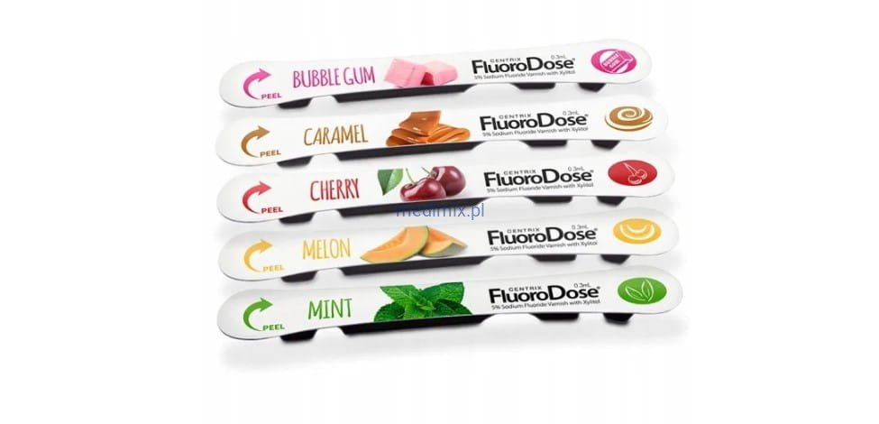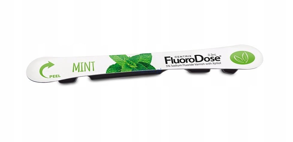 Fluoro Dose jest lakierem fluorującym zawierającym 5% fluorku sodu (22 600 ppm), pakowanego w jednorazowych dawkach LolliPack®, całkowicie aseptycznych i łatwych w zastosowaniu. Fluoro DoseTM nie barwi zębów na żółto i nie ma gorzkiego smaku. Wystarczy zdjąć opakowanie, osuszyć zęby, zanurzyć aplikator i można nakładać. Dawka fluoru dopuszczona przez FDA.