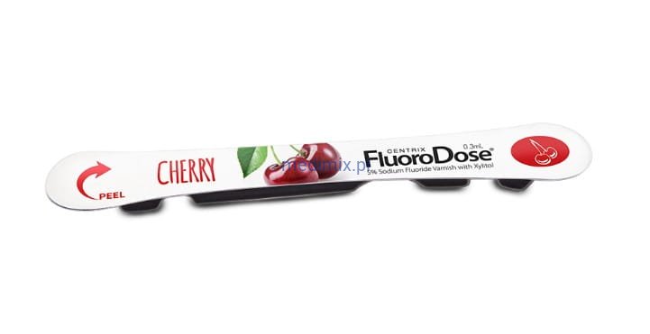 Fluoro Dose jest lakierem fluorującym zawierającym 5% fluorku sodu (22 600 ppm), pakowanego w jednorazowych dawkach LolliPack®, całkowicie aseptycznych i łatwych w zastosowaniu. Fluoro DoseTM nie barwi zębów na żółto i nie ma gorzkiego smaku. Wystarczy zdjąć opakowanie, osuszyć zęby, zanurzyć aplikator i można nakładać. Dawka fluoru dopuszczona przez FDA.