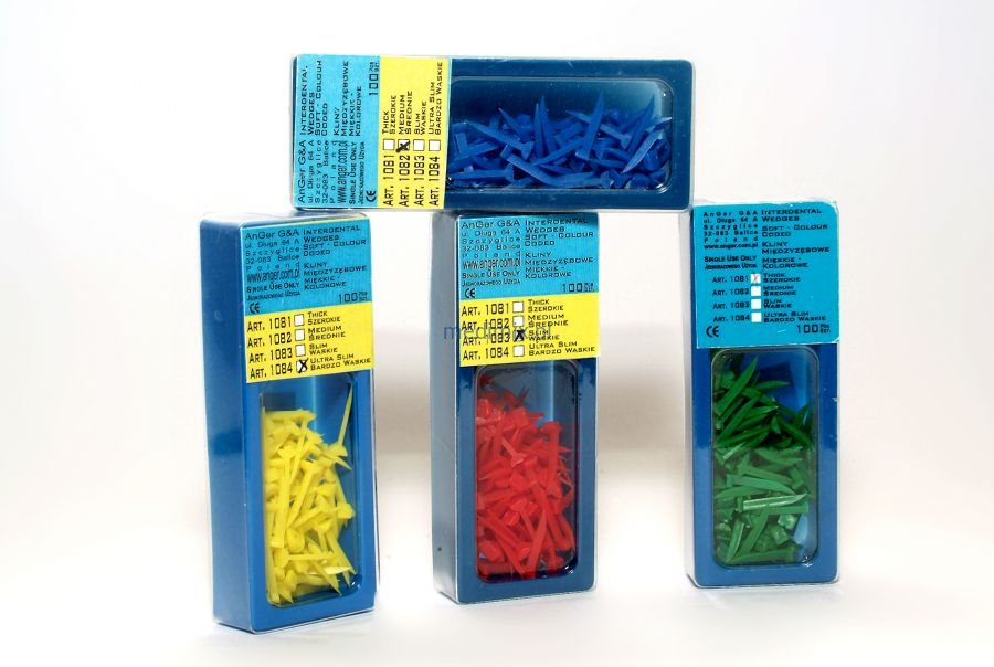 Kolorowe kliny międzyzębowe służące do czasowego odseparowywania zębów w trakcie trwania zabiegu.