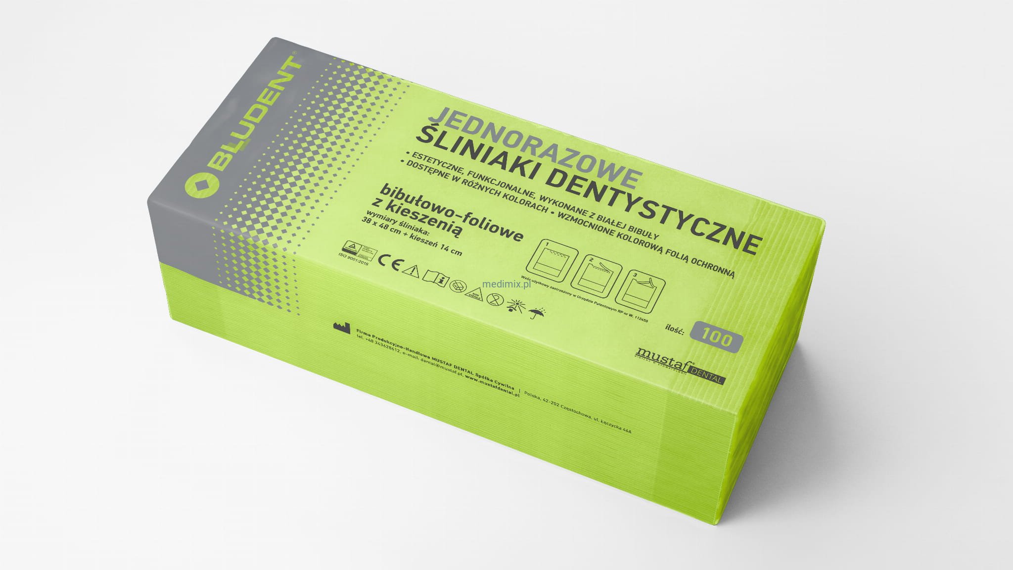 Dolna część śliniaka zakończona kieszenią, troczki w górnej części pozwalają na zawiązanie śliniaka na szyi pacjenta, dwie warstwy bibuły przedzielone warstwą folii PE